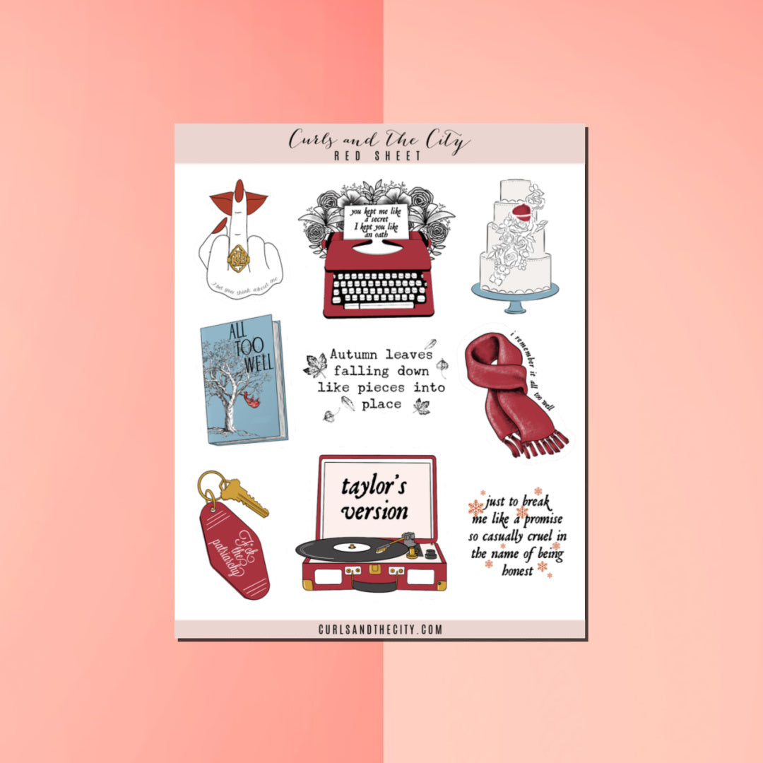 This Red Sticker Sheet is full of all the red scarf swiftie vibes. Perfect for your bullet journal, planner, scrapbook, or to just decorate the envelopes of a greeting card you're about to send out. All of our stickers are hand drawn, printed, and packaged by us for a personalized feel. Each order is sent out with small gift as a thank you!