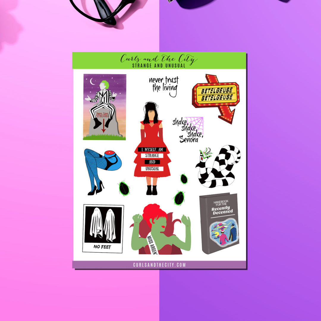 This Strange and Unusual Sticker Sheet is inspired by one of Tim Burton's classics, Beetlejuice. If this is one of your Halloween favorites too then this sticker sheet is perfect for your bullet journal, planner, scrapbook, or to just decorate the envelopes of a greeting card you're about to send out. All of our stickers are hand drawn, printed, and packaged by us for a personalized feel.